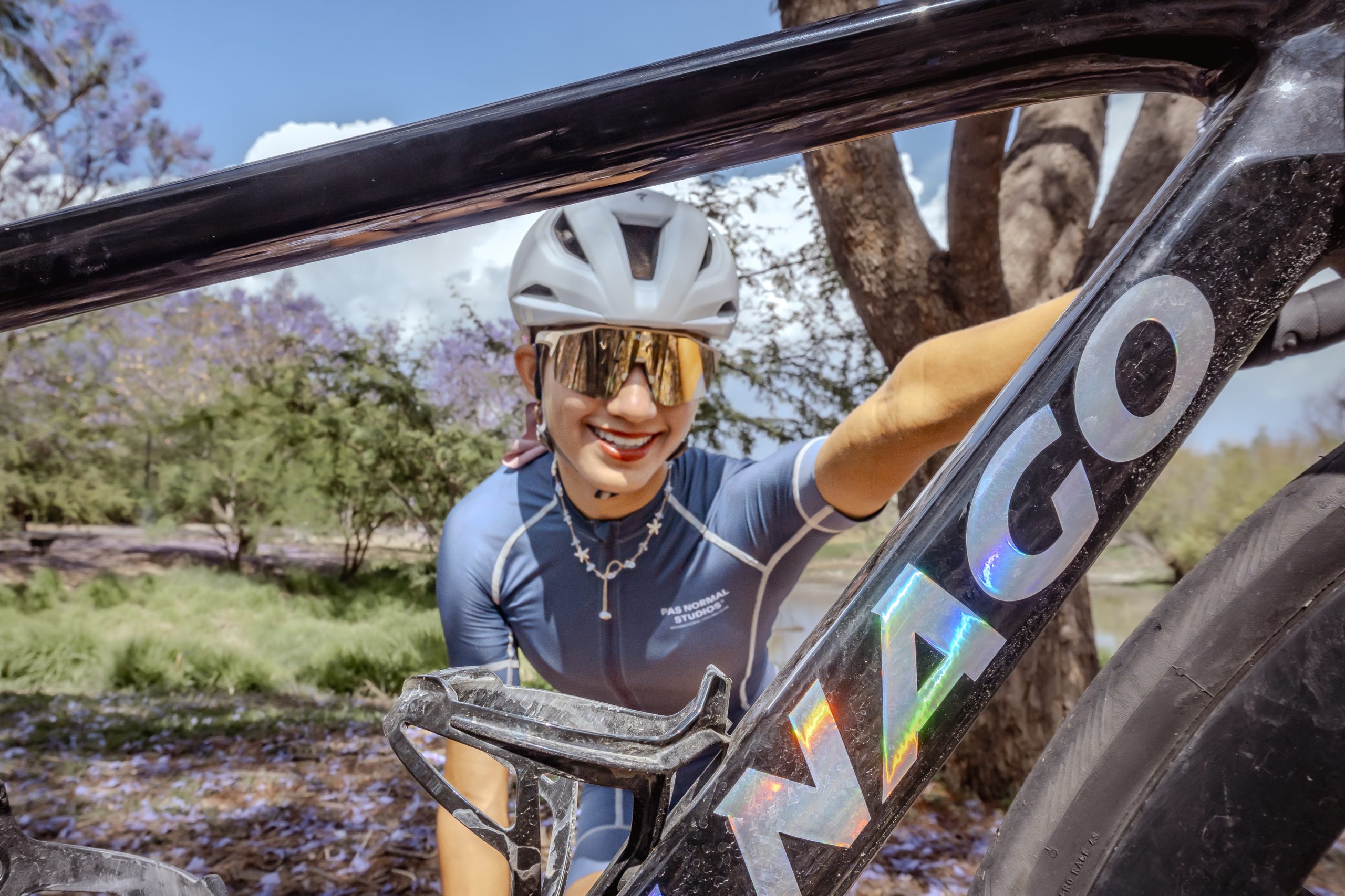 En las tomas podemos ver desde los momentos de preparación —el ajuste preciso del casco y la revisión mecánica— hasta el despliegue de potencia en el asfalto. Las jacarandas, con sus flores violetas en el suelo, sirvieron de marco perfecto para contrastar con el azul profundo y el verde del kit de competencia.
