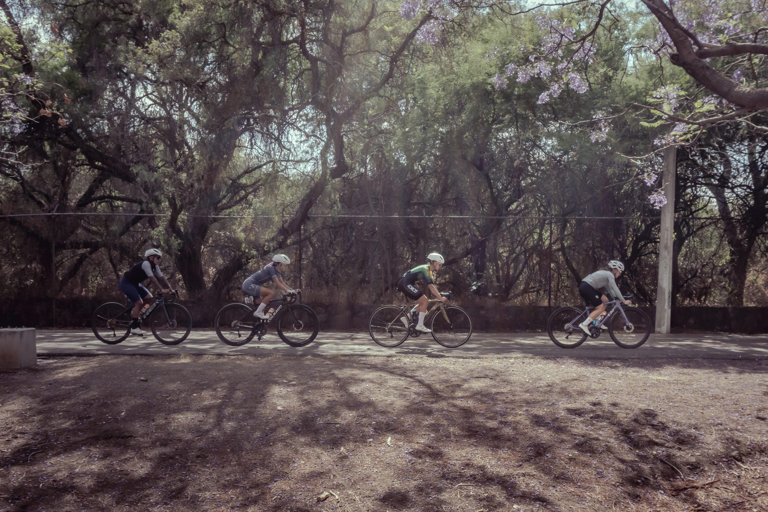 Fotografiar ciclismo en movimiento siempre exige velocidad, pero esta vez el desafío no fue solo el ritmo de las atletas, sino la luz. Nos encontramos en un escenario envuelto por árboles, donde la luz del sol golpeaba con fuerza, creando sombras muy duras y contrastes agresivos.